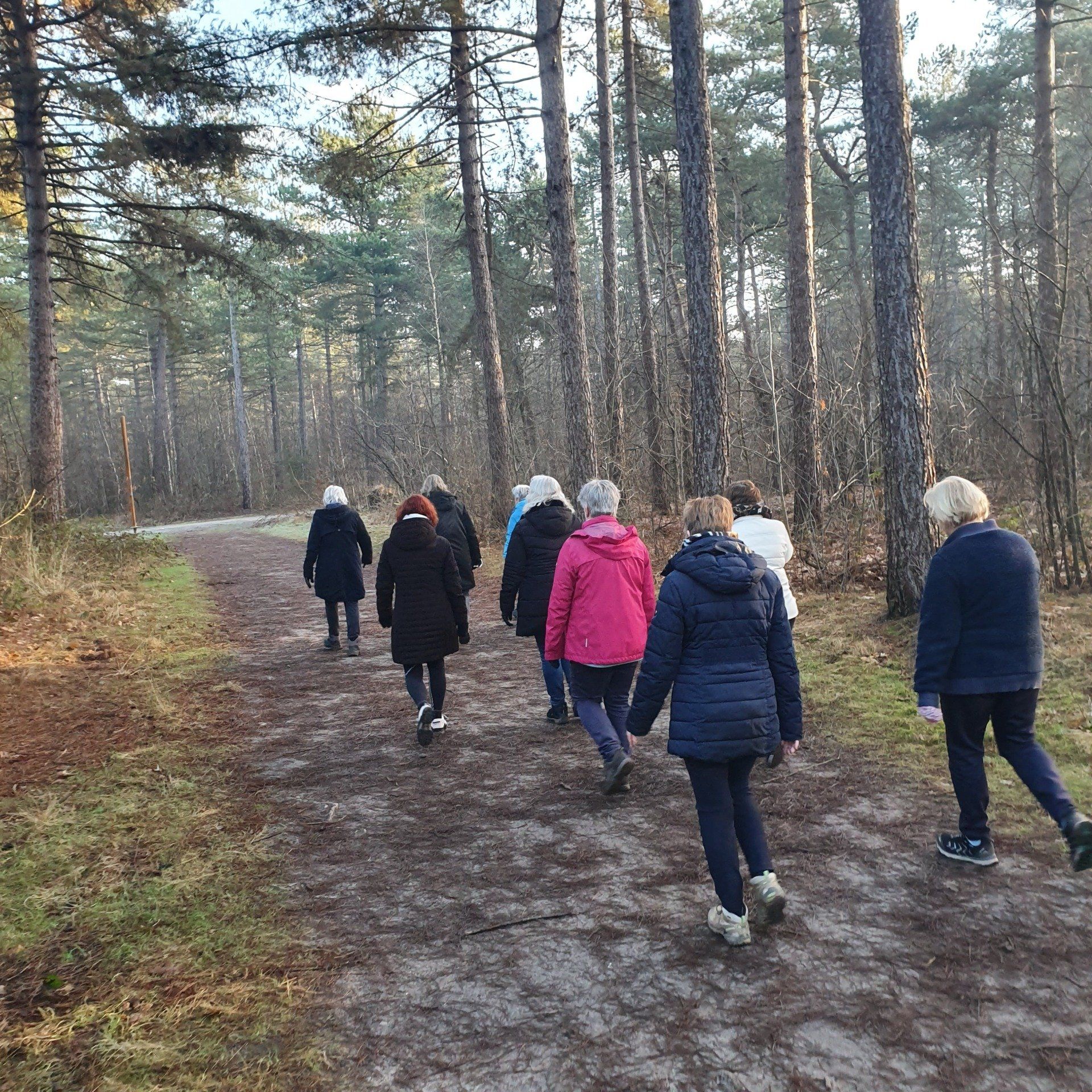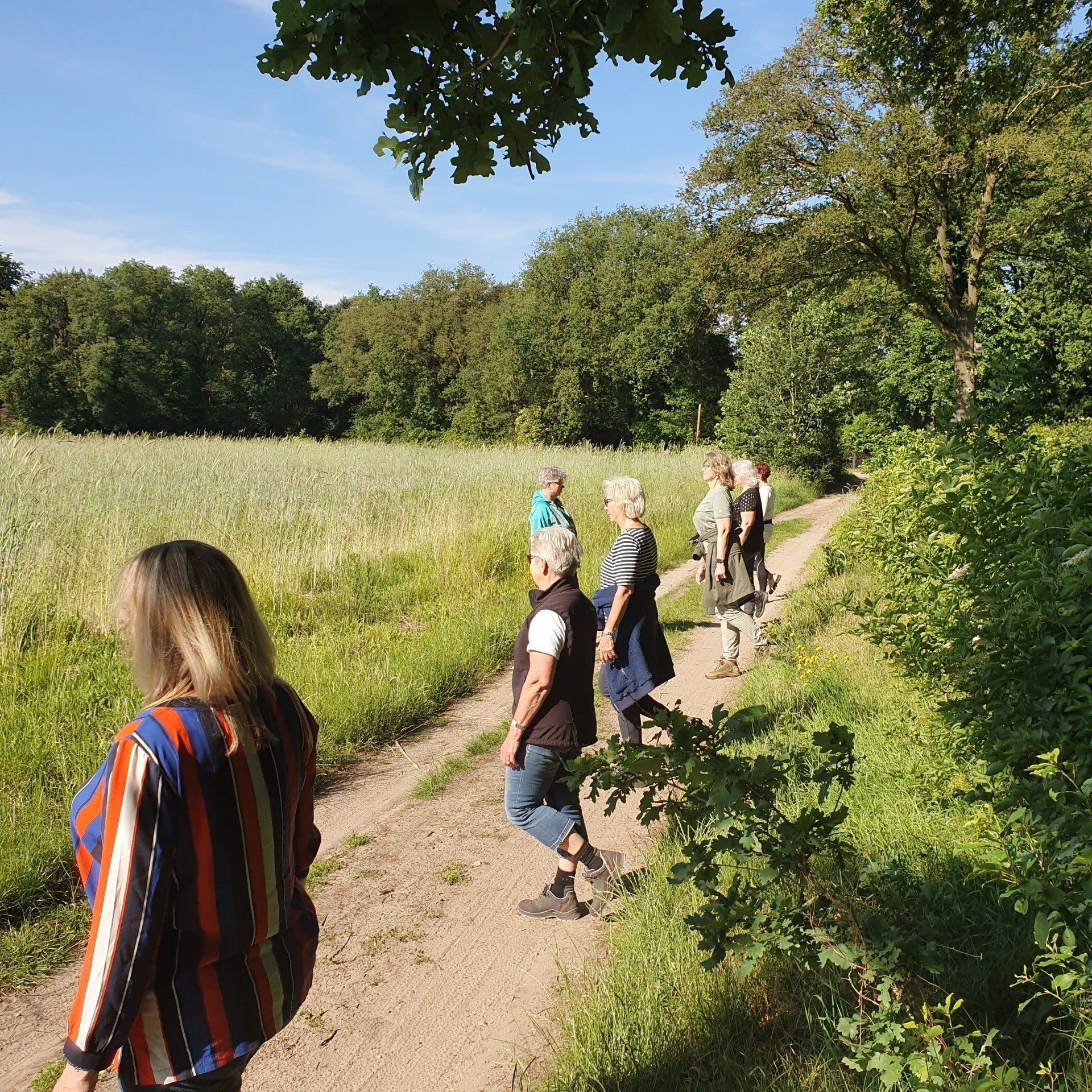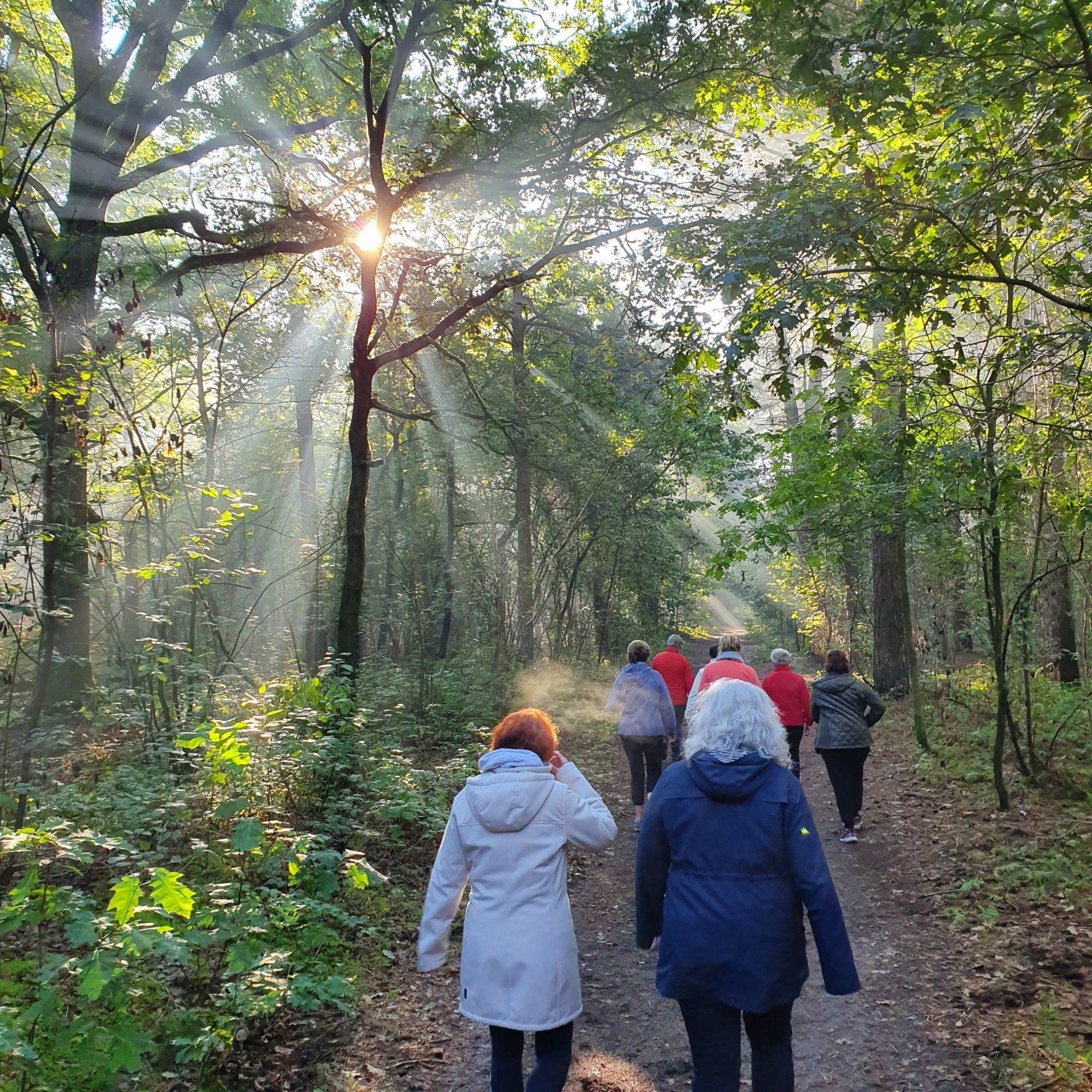 Samen wandelen in het bos. Lekker buiten bewegen met oefeningen voor balans en flexibiliteit tussendoor. Inspannen en ontspannen.
